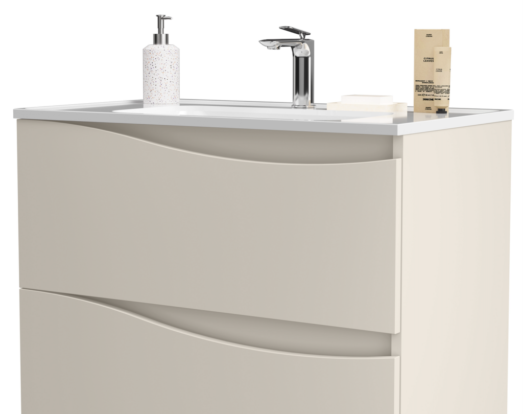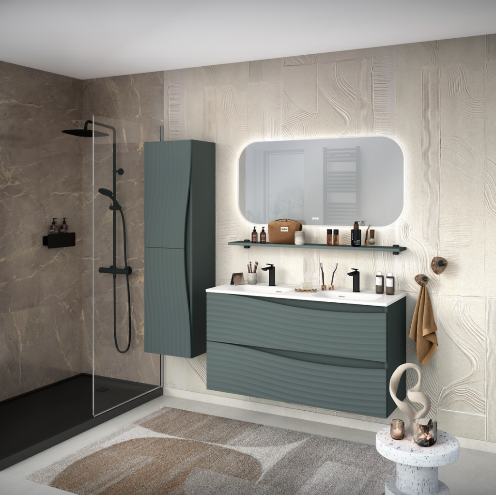 La version Vague se distingue par sa façade laquée mate aux lignes courbes affirmées. Disponible en 18 coloris, elle apporte du caractère et une élégance intemporelle à la salle de bains. Quelle que soit la finition choisie, Ecume permet de créer des compositions personnalisées, en accord avec les goûts et les envies de chacun.