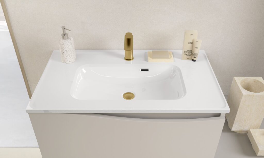 Deux styles de plan vasque viennent parfaire le design contemporain de la ligne. Le plan vasque Volupté, en marbre de synthèse avec revêtement gelcoat blanc brillant, séduit par son toucher lisse, sa résistance à l’usure et aux tâches et sa parfaite étanchéité. Le plan vasque CéramLigne, en grès émaillé blanc brillant, offre, quant à lui, une hygiène optimale et un rendu esthétique durable.