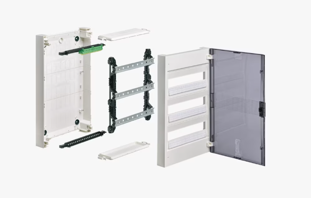 Il est entièrement modulable et offre un choix multiple d’applications. Disponible en métal ou plastique, il va de 48 à 168 modules, avec 2 à 7 rangées de 24 modules, et peut être installé en saillie ou encastrée.